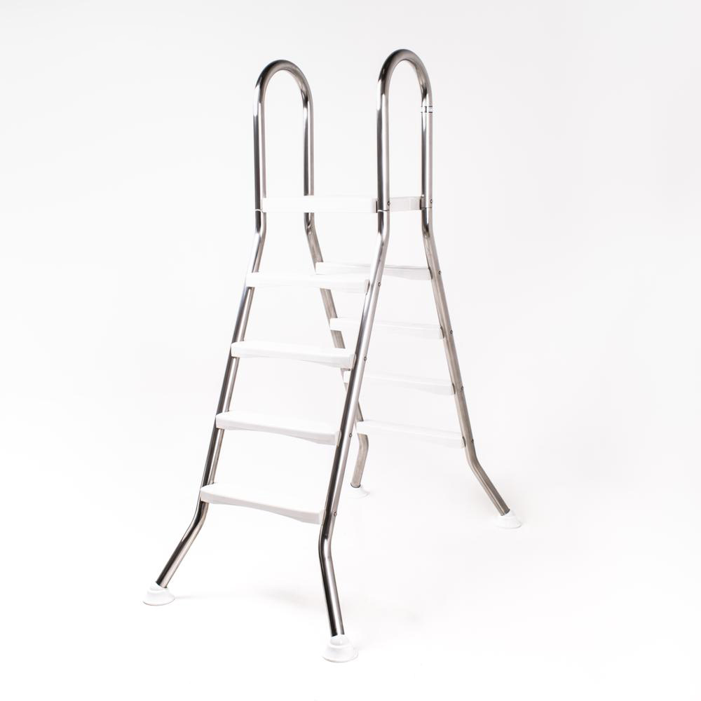 Welldana® stege för fristående pool. Tillverkad i solitt Ø43 mm blankpolerat rostfritt stål, med halksäkra rostfria steg och tålig plattform i vit ABS-plast. Levereras i delar, komplett med steg, plattform, skruvar och tåliga gummifötter för smidig och stabil användning samt skydd av poolbotten.