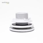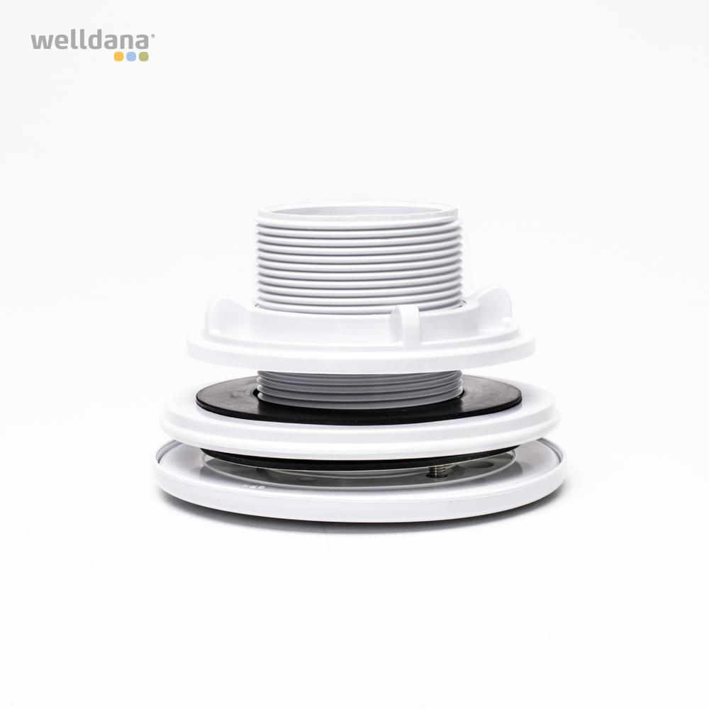 Den vita flänsen och muttern sitter på utsidan av poolen