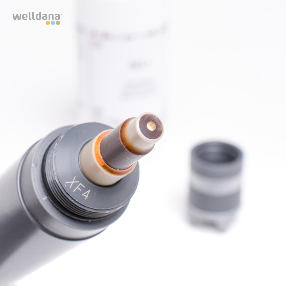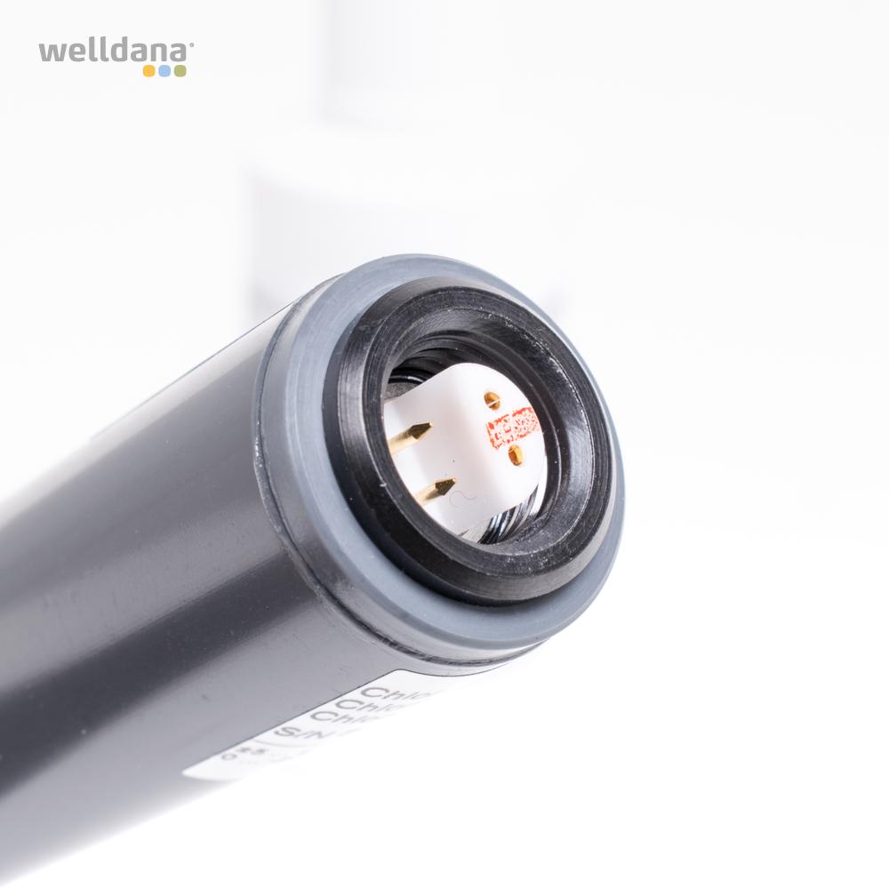 Fri klorsensor för Welldana kemikontroll. Vid byte av sensorn är det viktigt att fylla membranhuset med elektrolytvätska och föra in sensorn försiktigt och vertikalt i det lilla hålet. Överskott av elektrolytvätska kommer att rinna ut ur hålet på sidan av membranhöljet.