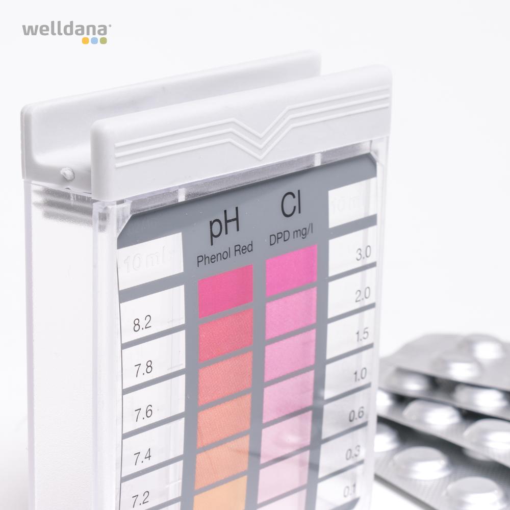 Testsats för snabb mätning, enkelt att läsa av kemikalievärdena i poolvattnet. Levereras komplett med smart transparent tvådelad plastbehållare med lock och tryckt färgvärdetabell på framsidan. Det finns 2 förpackningar med varje typ av tablett, för upplösning i vattnet. Mycket enkel att använda, både privat och professionellt: