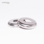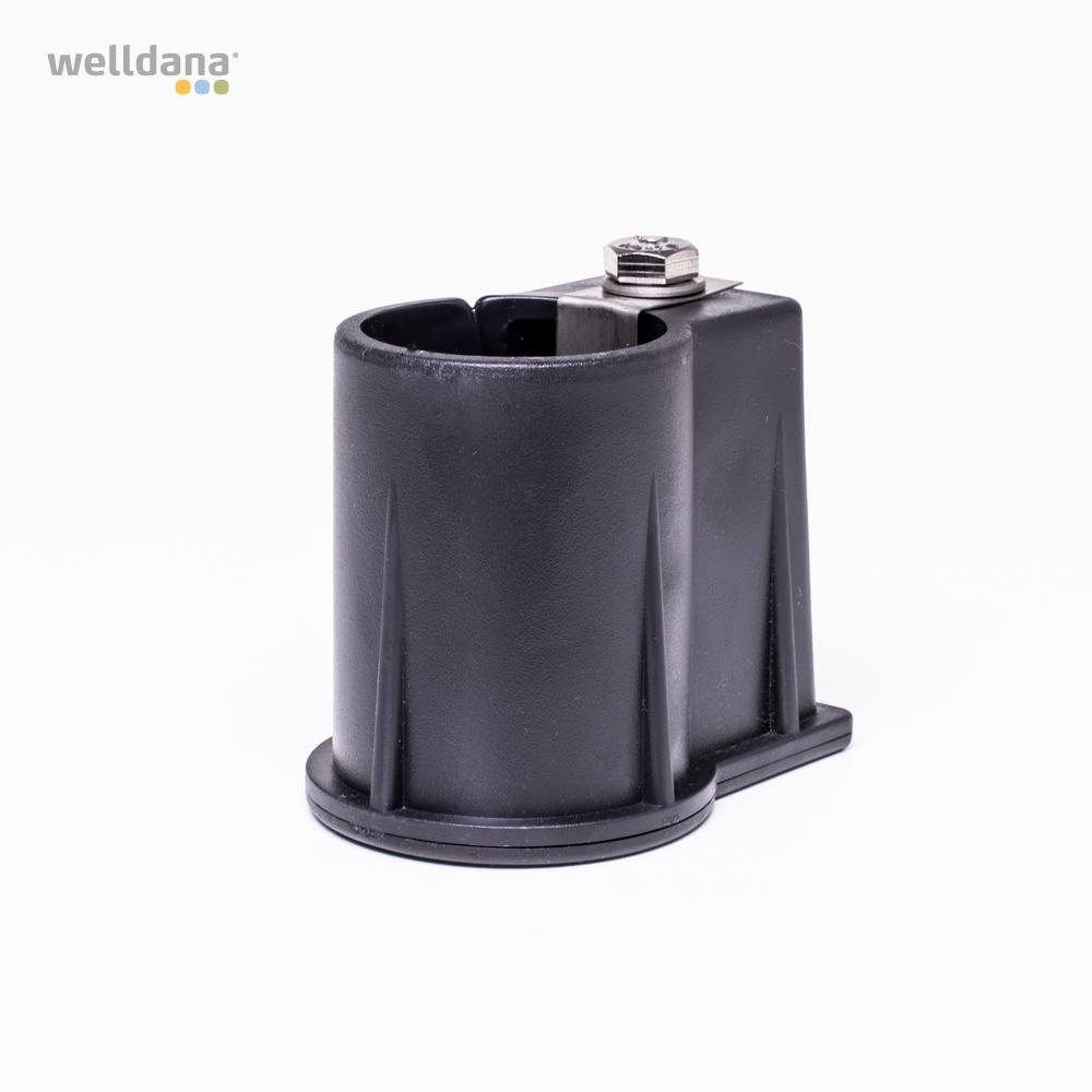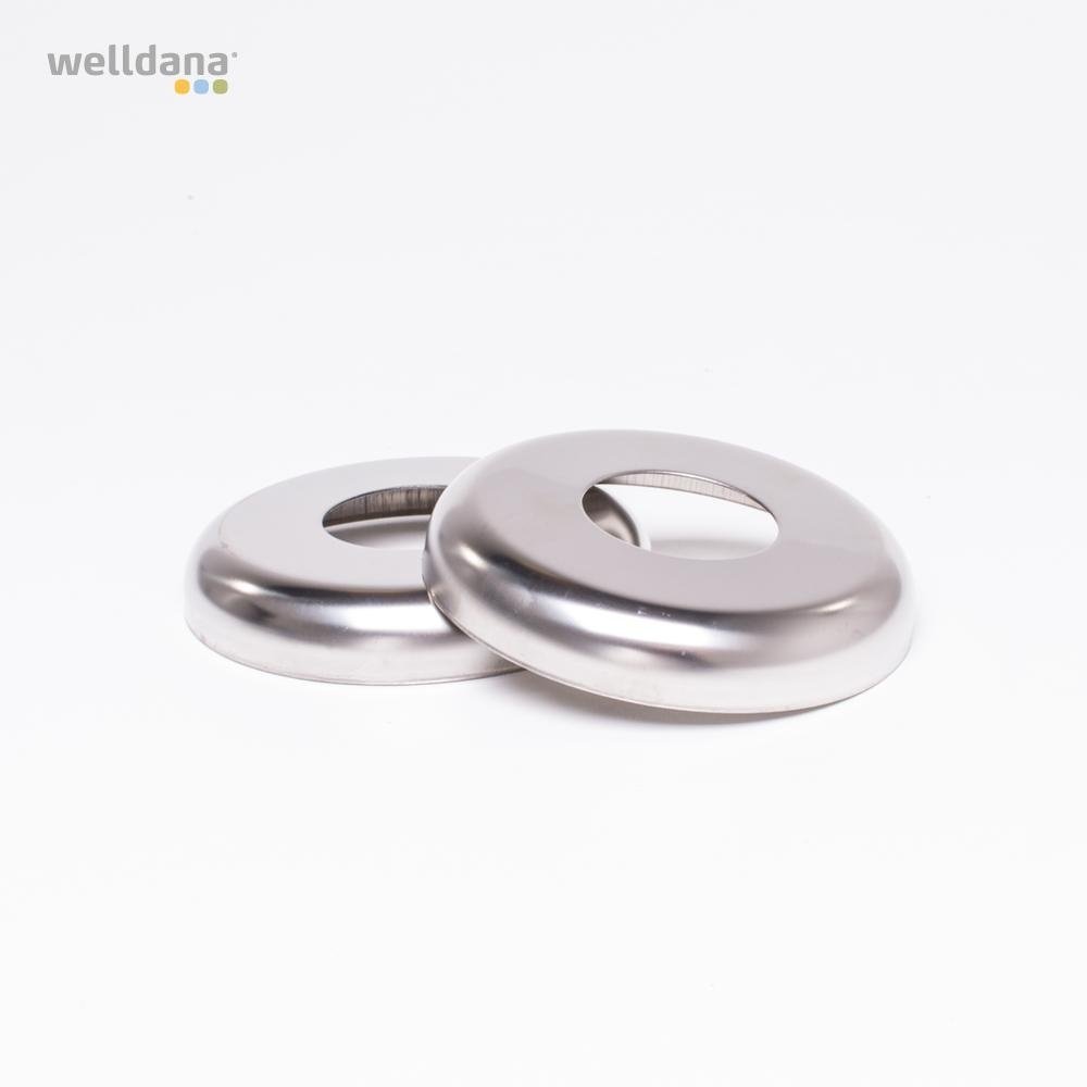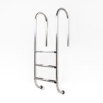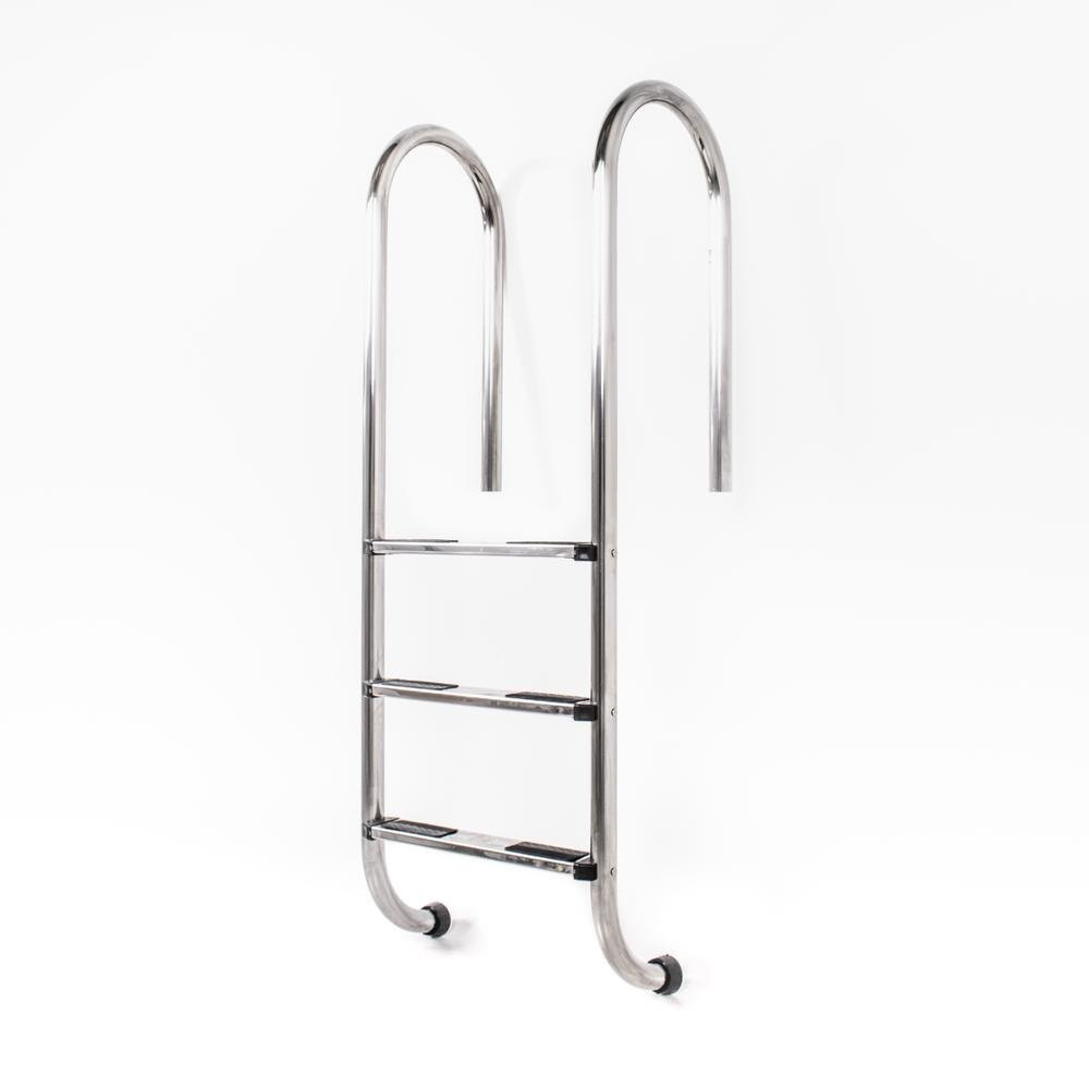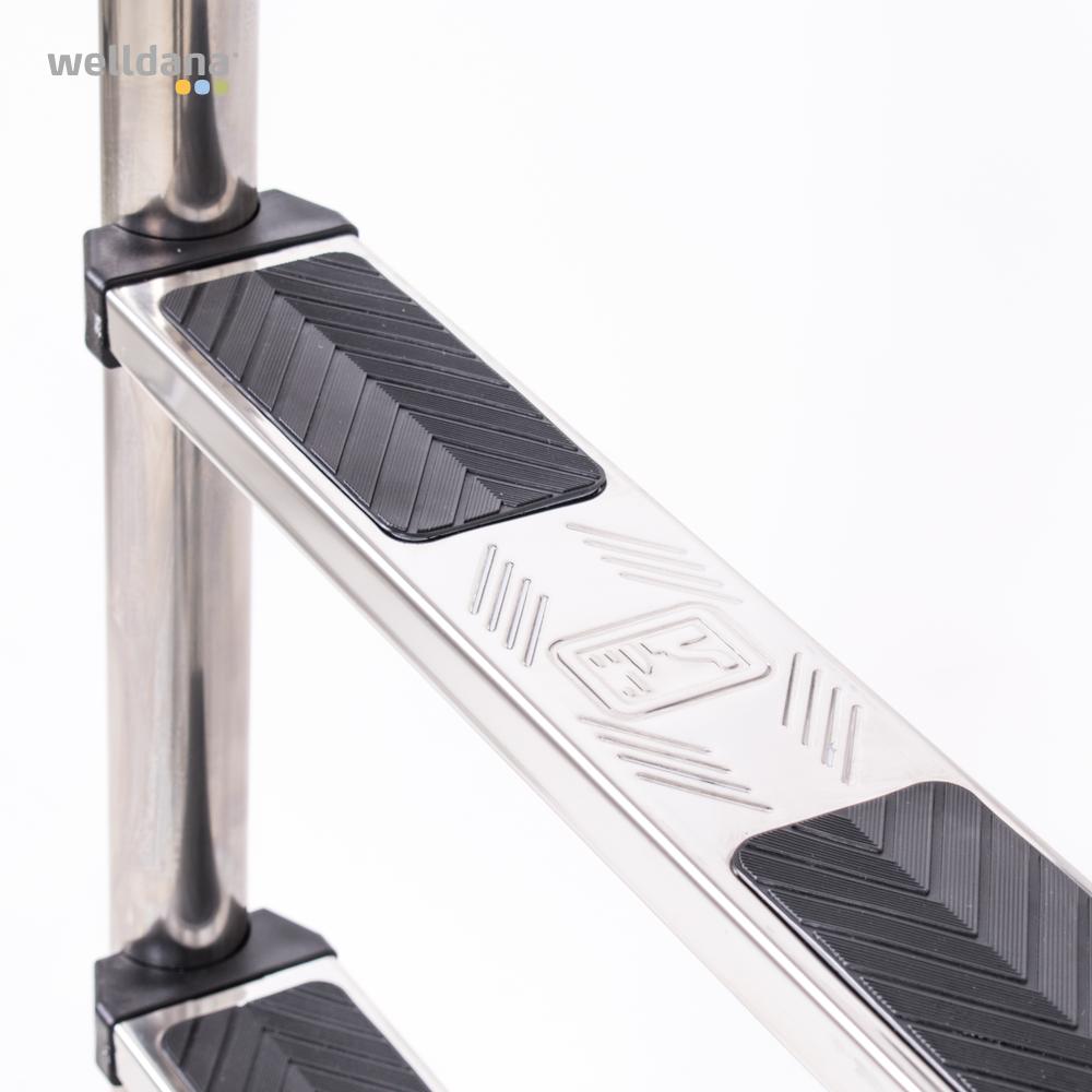 Welldana® stege i smal design. Tillverkad i solitt Ø43 mm blankpolerat rostfritt stål och med halksäkra rostfria steg. Levereras omonterad, komplett med gjutna beslag och tåliga gummifötter för att skydda poolen.
